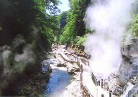 | 長野県渋地獄谷温泉の噴泉 | 秋田県小安峡の「大噴湯」 |